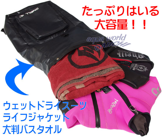 ウェットスーツ等一式がすっぽり入る大容量防水バッグ。