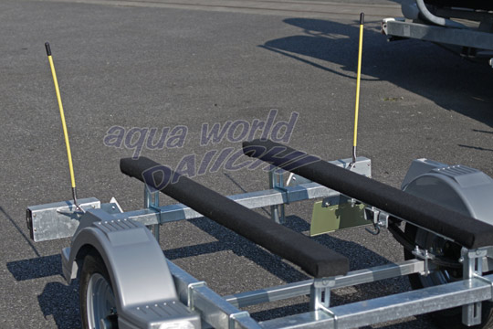 今回取り付けたボートトレーラーには、船とこのステーが干渉する可能性が無く、ポールの視認性を上げるためにより高くセットしたい為、上記のステーを上側オフセットにて取付させて頂きました。