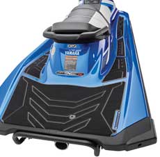 ・ワイドリア・プラットフォーム / デッキマット スターンの広いプラットフォームからステップにかけて、ニュータイプのカットパターンを施したデッキマットを採用。常にアグレッシブなライディングに挑むライダーの足元を支えます。プラットフォームはシュノ―ケリングなどのマリンスポーツの小休止に、ウェイクボードプレイの際は、ビンディングの装着に便利な広さを確保しています。 |
