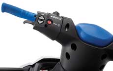 ・RiDE / エレクトリック・トリム・システム 左側のハンドルにあるRiDEレバーで「減速・後進」の操作をします。RiDE操作中はメーターに「R」を表示。またエレクトリック・トリム・システムのボタン操作により、走行状態に応じた最適なトリムに設定できるシステムです。上下2段階づつの調節が可能でマルチファンクション・ディスプレイにトリムポジションを表示。エンジン停止時やリバースゲートがニュートラルまたは後進になった時にはトリム設定がセンターポジションに戻ります。 |